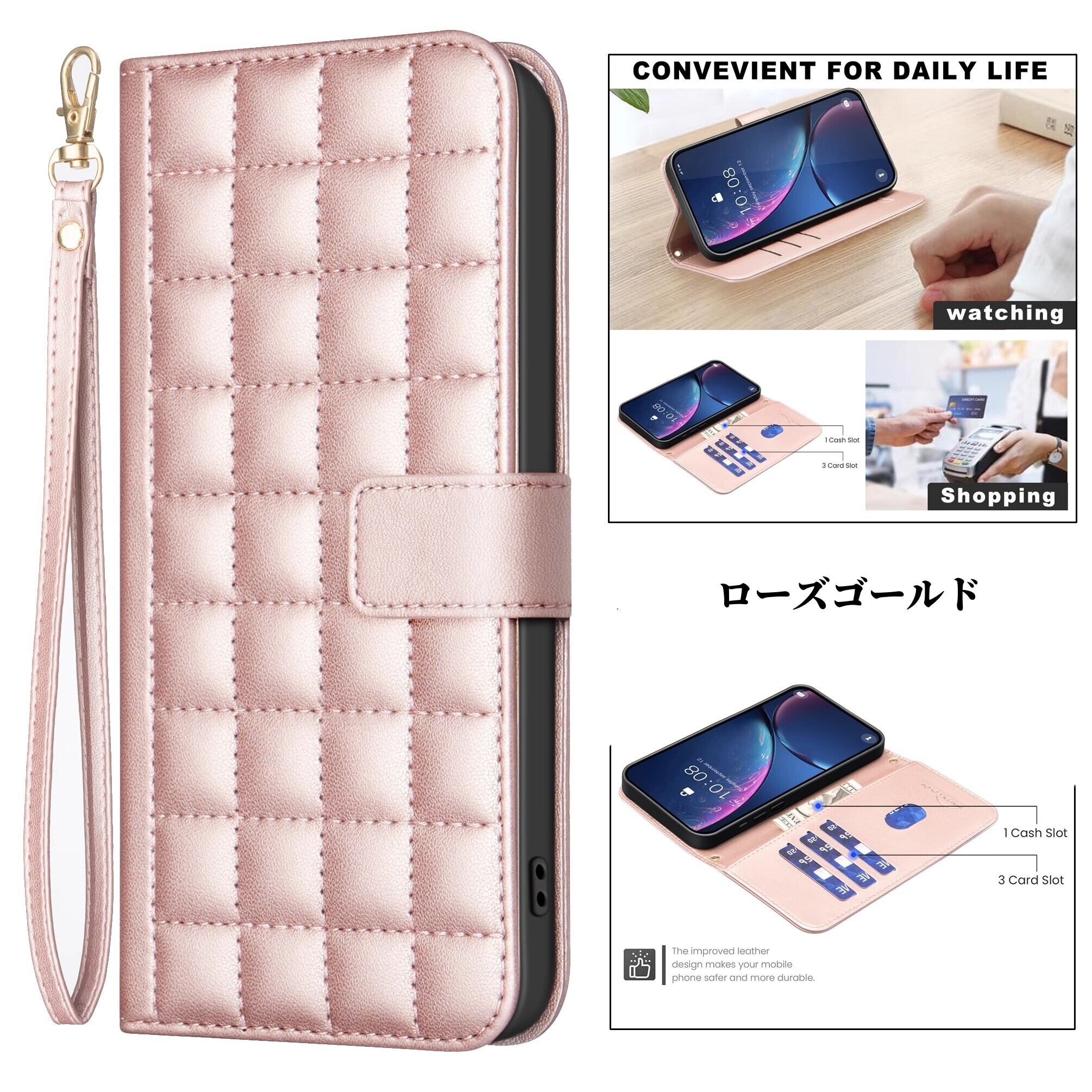 ●耐久性に優れたPUレザー素材を使用しており、落下や摩擦から大切なデバイスをしっかりと守ります。さらに、ストラップ付きで持ち運びもスムーズです。