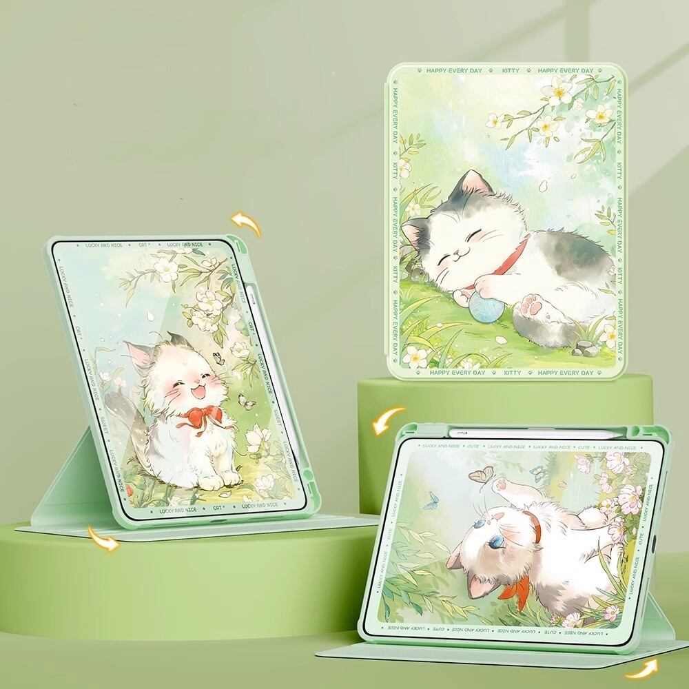 送料無料!2025年春発売 11インチ iPad Air (M3) ケース タブレットPC 保護カバー スタンド機能付き 360度回転 ペン入れ ハンドストラップ付き かわいいねこデザイン!