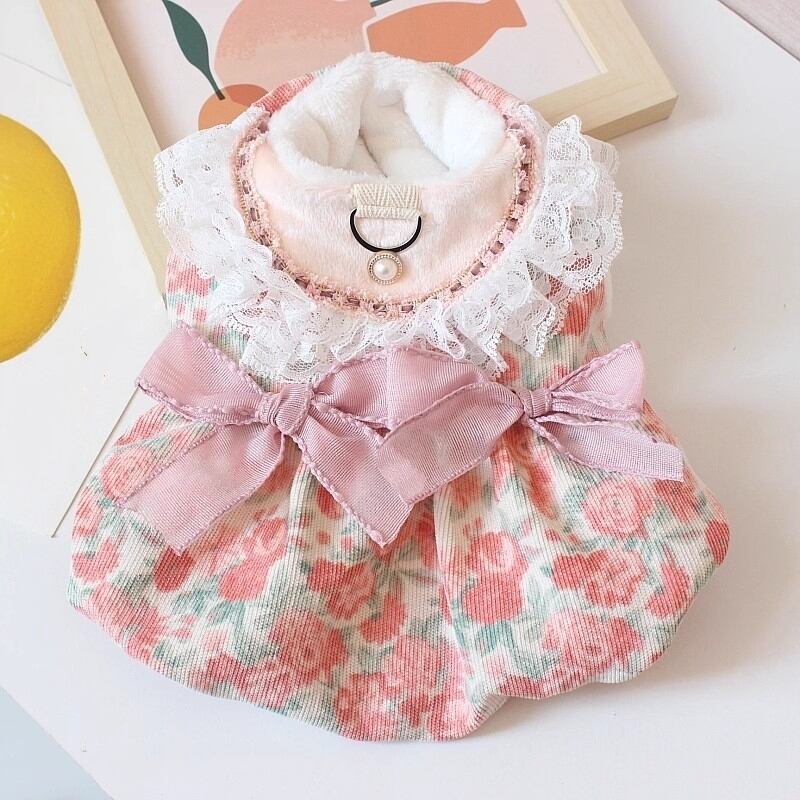 ペット服 パフスリーブワンピース お姫様風 フラワープリント フック付き リード対応 秋冬用 裏地起毛 暖かい 保温 可愛い 猫 犬用 ドッグウェア テディ犬 ビションフリーゼ 小型犬 | nextcase