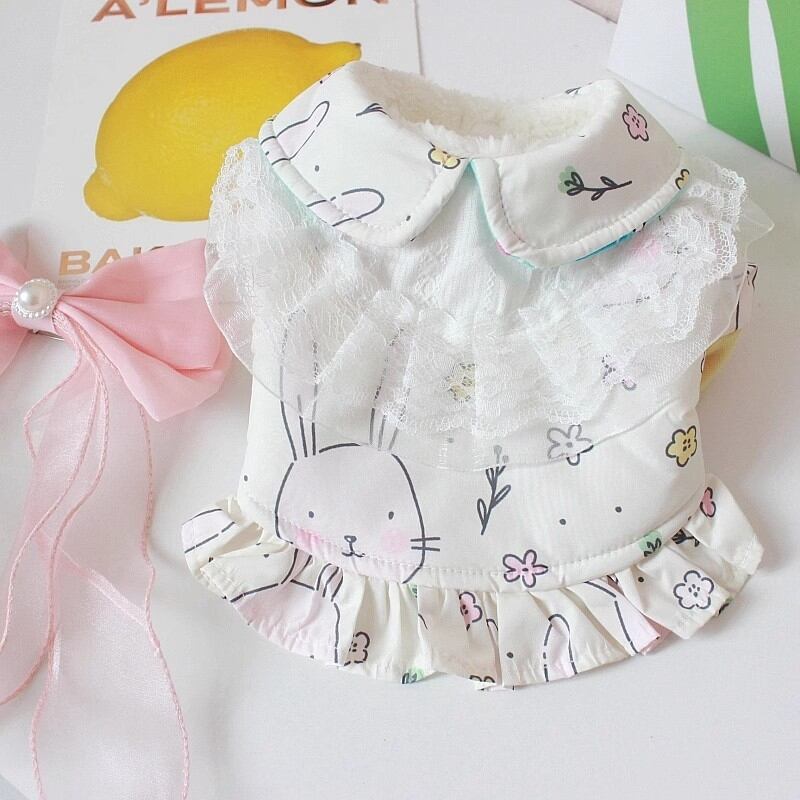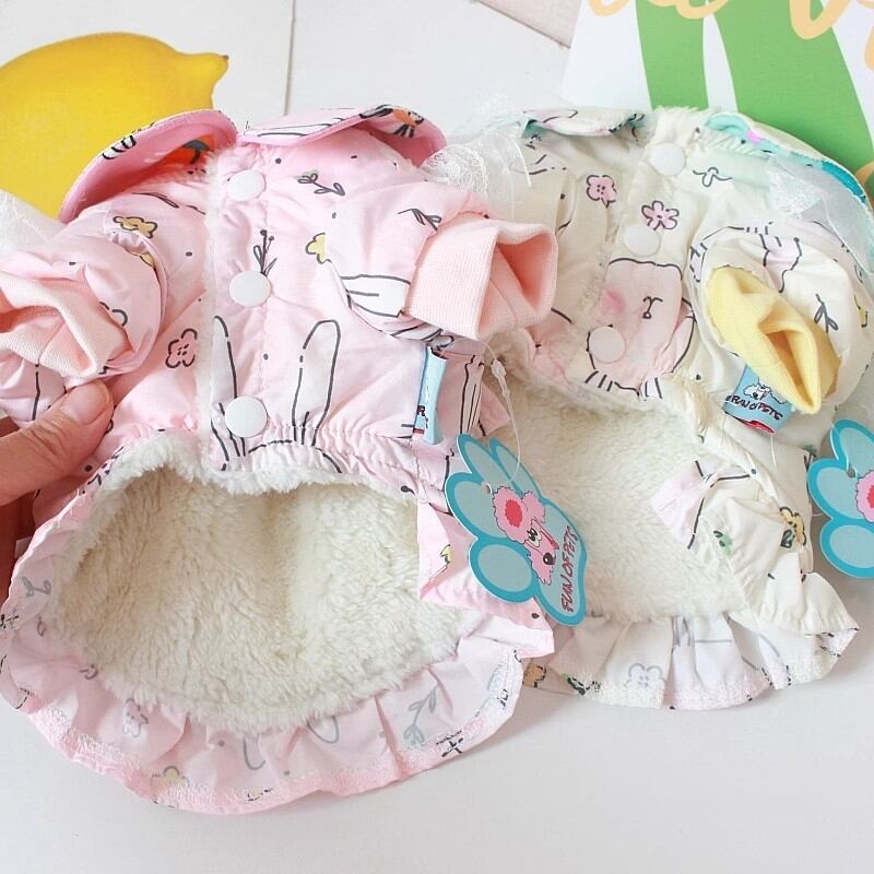 ペット服 厚手ワンピース うさぎ柄 冬用綿入りウェア リボン取り外し可能 犬猫用ドッグウェア 小型犬 中型犬