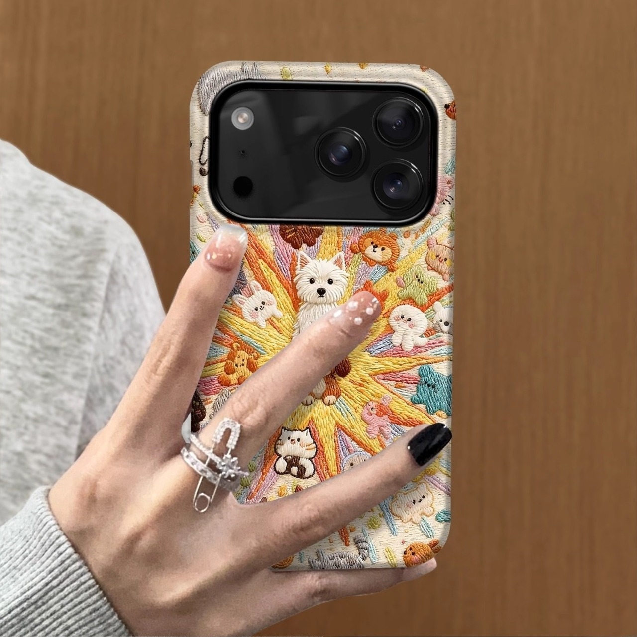 スマートフォンケース iPhone17 Proケース 刺繍デザインでとびきり可愛い!布調のカートゥーンスタイルが女子心をくすぐるアイテムです。全包囲でしっかりと守る耐衝撃性を備え、柔らかいソフトケースに仕上げました。あなたの個性を引き立て、日常をもっと楽しく彩ります!