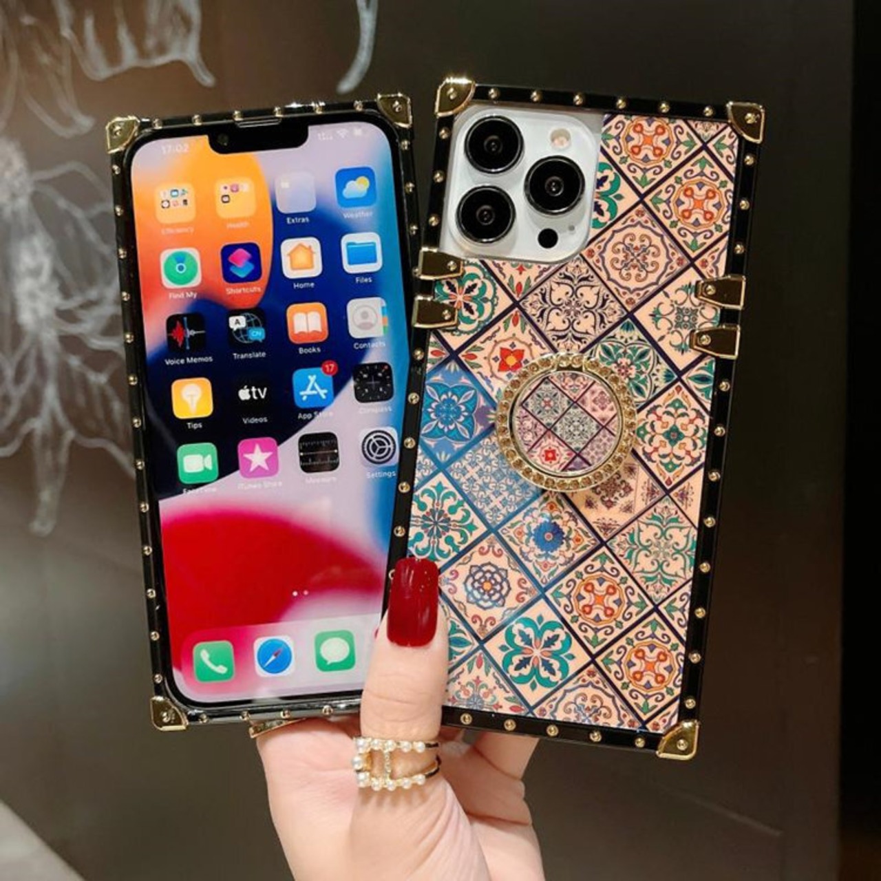 このケースは、衝撃や傷から大切なスマートフォンをしっかりと保護します。まるでアクセサリーのようなリングも付いており、持ち運びや操作がしやすくなっています。さらに、ストラップも付属しているため、落下や紛失の心配もありません。