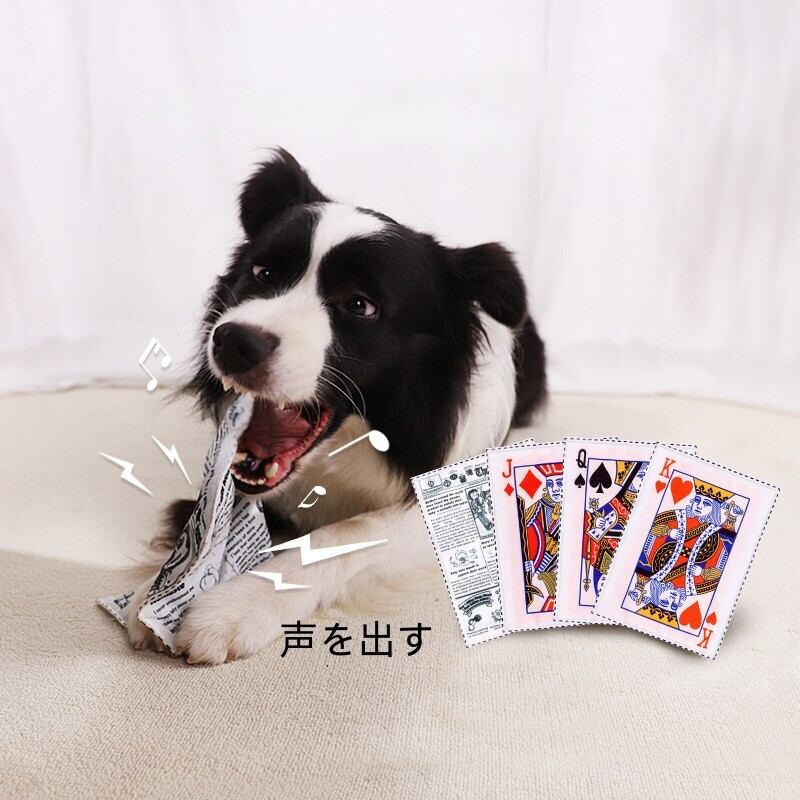 リラックスタイムを楽しく過ごせる、鳴るおもちゃのご紹介です。新聞用紙やトランプをモチーフにしたリアルなデザインが特徴です。このおもちゃは柔らかくて噛む耐久性にも優れており、お子様や小動物にも安心して遊んでいただけます。