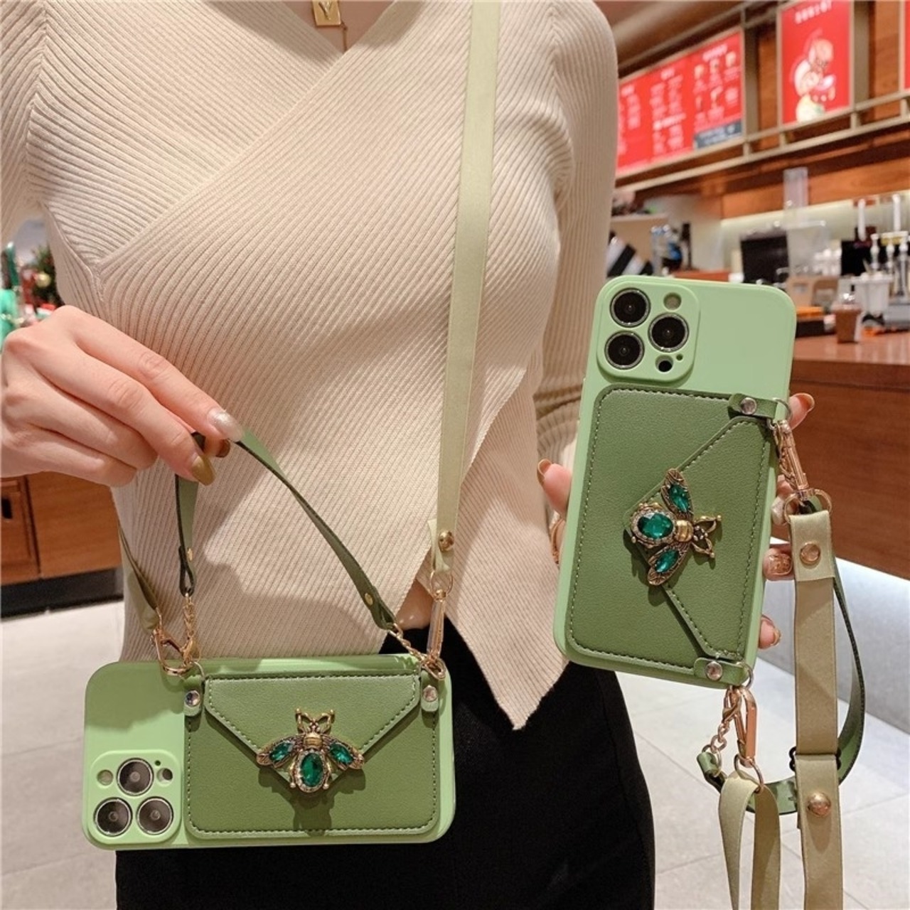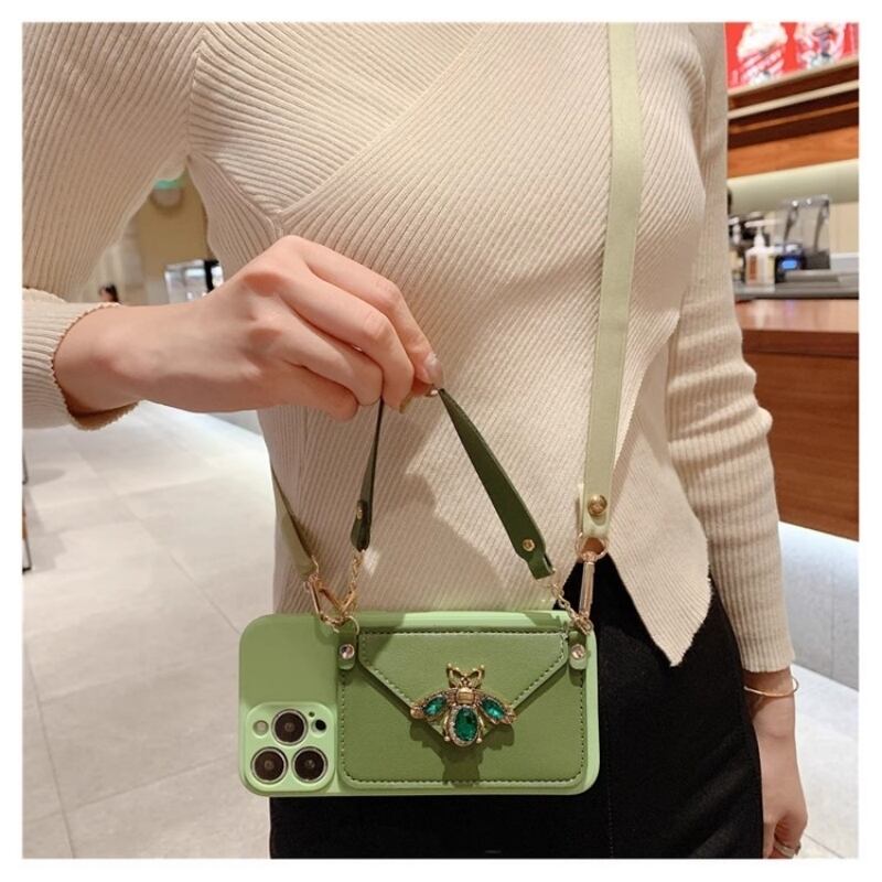 送料無料!iPhone 16 ProMax ケース アイフォン16 プロ マックス ケース スマホケース 保護カバー 6.9インチ 背面カバー 小銭を入れ カード収納 長短チェーン付き ミツバチ グリーン | nextcase